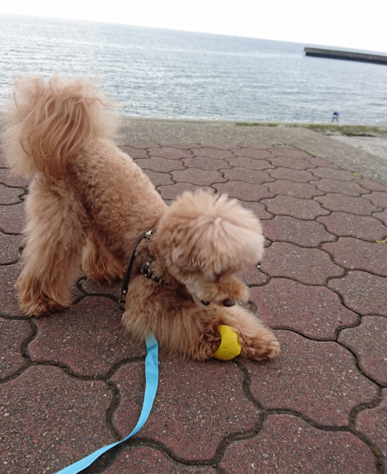 海辺だけど砂浜じゃない場所でボール遊び〜♪