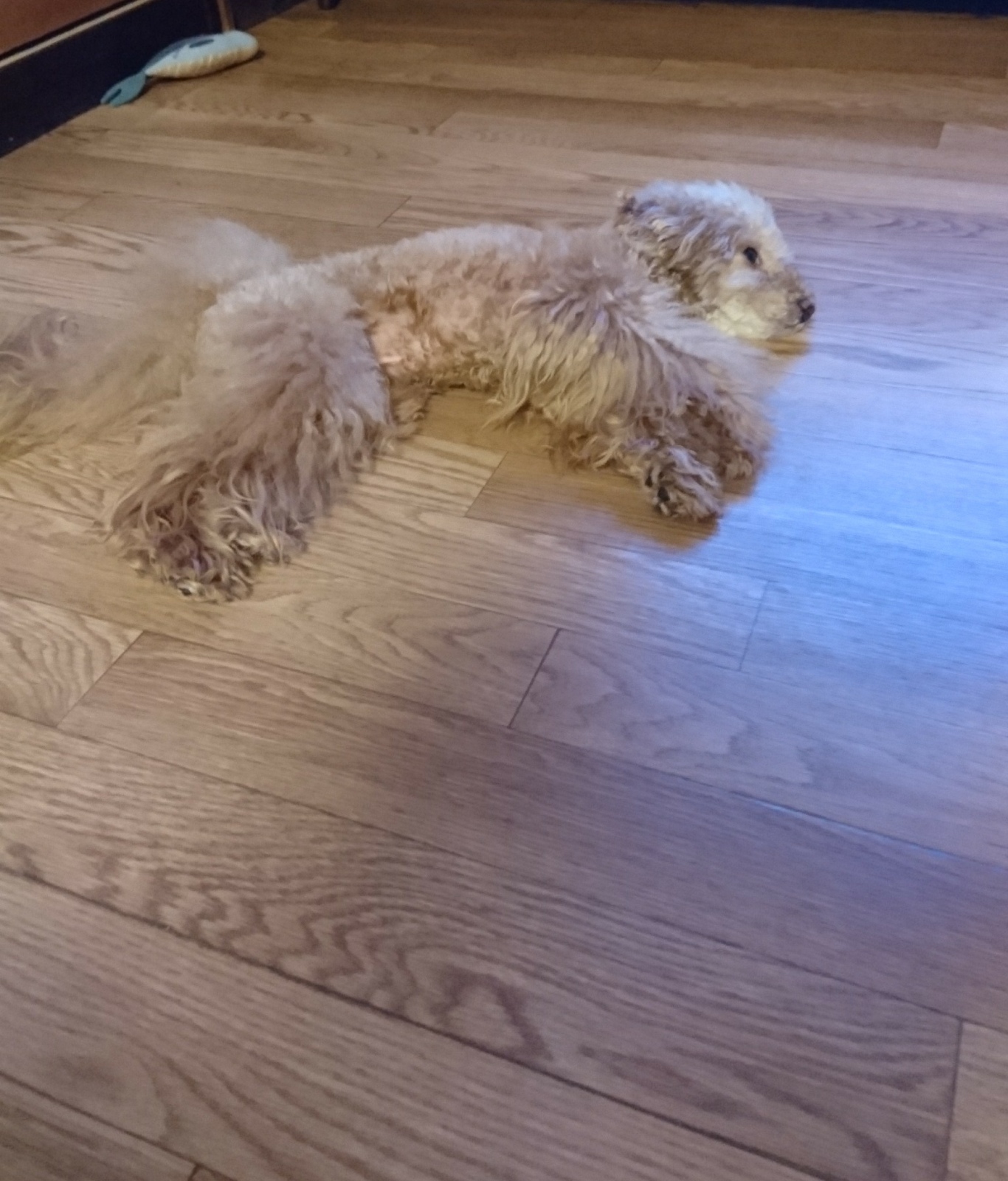 オモチャで遊んで床に寝転んでクールダウン中〜。